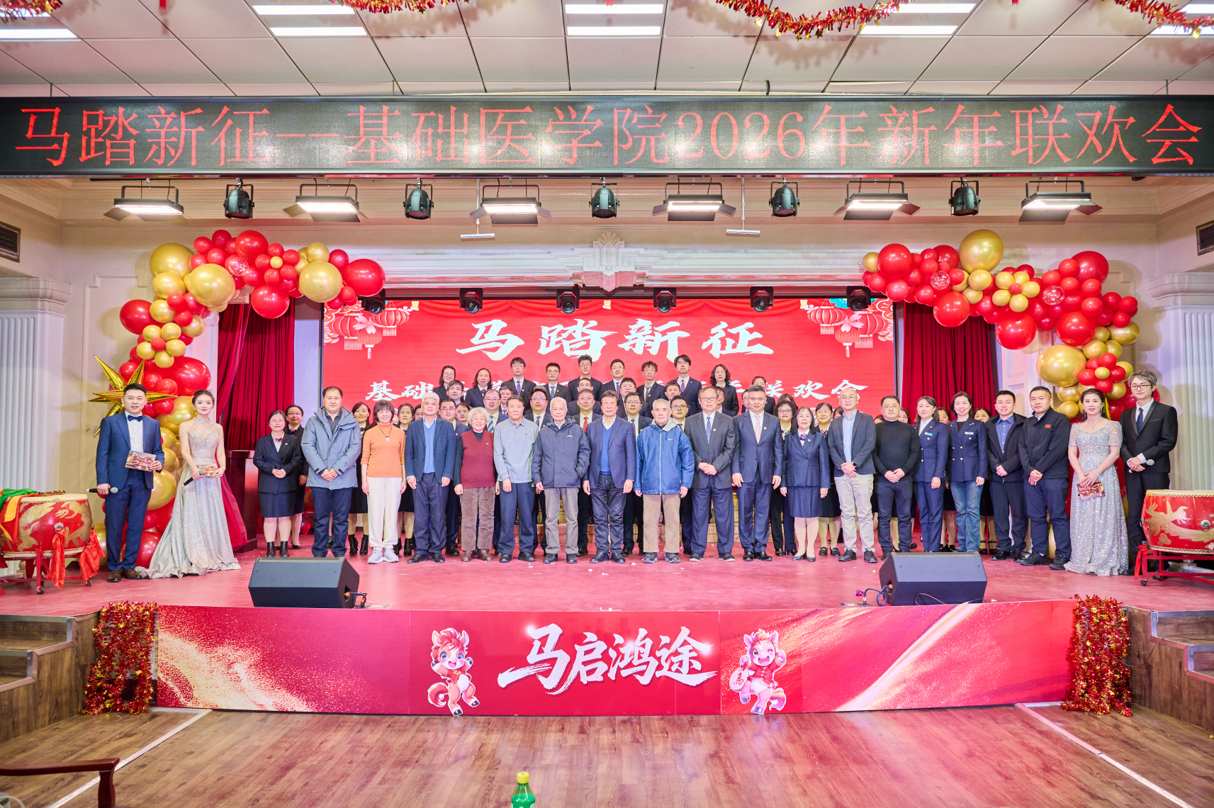 在教学科研、人才培养等领域的丰硕成果,也凝聚了对2026年医学教育创新发展的壮志豪情。节目篇章精彩纷呈,跨界融合亮点纷呈:长春南湖实验中学2025级舞蹈社团的孩子们带来舞蹈《东方红》,以稚嫩身影演绎赤诚初心,用朝气舞姿传递红色力量;组织学与胚胎学、细胞遗传、病原生物学、免疫、三综合学系的老师们联袂呈现的《中国龙》,刚劲动作与昂扬气势尽显中华儿女的精神图腾,赢得全场阵阵喝彩;生理学系的宋浩天、王迦南合唱一曲《时差》,温柔旋律承载细腻情感,让观众沉浸在音符编织的温情世界;教工第一党支部带来的《疯狂动物城》歌舞表演,重现动画里的热血欢乐,展现了教职工队伍的多元风采与蓬勃活力。